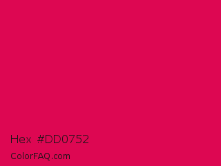 Hex #dd0752 Color is a normal rose color and the nearest color is Debian Red #d70a53. Hex code #dd0752 and RGB value is rgb(221,7,82). In RGB color space, this color is composed of 87% red, 3% green, 32% blue, In CMYK color space, this color is composed of 0% cyan, 97% magenta, 63% yellow , 13% black , In HSL color space, this color has a hue angle of 339° , 94% saturation and 45% lightness.