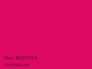 Hex #dd0764 Color is a normal rose color and the nearest color is Raspberry #e30b5d. Hex code #dd0764 and RGB value is rgb(221,7,100). In RGB color space, this color is composed of 87% red, 3% green, 39% blue, In CMYK color space, this color is composed of 0% cyan, 97% magenta, 55% yellow , 13% black , In HSL color space, this color has a hue angle of 334° , 94% saturation and 45% lightness.