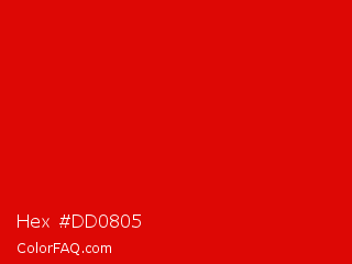 Hex #dd0805 Color is a normal red color and the nearest color is Rosso Corsa #d40000. Hex code #dd0805 and RGB value is rgb(221,8,5). In RGB color space, this color is composed of 87% red, 3% green, 2% blue, In CMYK color space, this color is composed of 0% cyan, 96% magenta, 98% yellow , 13% black , In HSL color space, this color has a hue angle of 1° , 96% saturation and 44% lightness.