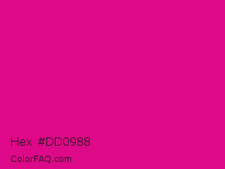 Hex #dd0988 Color is a normal magenta color and the nearest color is Mexican Pink #e4007c. Hex code #dd0988 and RGB value is rgb(221,9,136). In RGB color space, this color is composed of 87% red, 4% green, 53% blue, In CMYK color space, this color is composed of 0% cyan, 96% magenta, 38% yellow , 13% black , In HSL color space, this color has a hue angle of 324° , 92% saturation and 45% lightness.