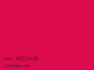 Hex #dd0a4d Color is a normal rose color and the nearest color is Debian Red #d70a53. Hex code #dd0a4d and RGB value is rgb(221,10,77). In RGB color space, this color is composed of 87% red, 4% green, 30% blue, In CMYK color space, this color is composed of 0% cyan, 95% magenta, 65% yellow , 13% black , In HSL color space, this color has a hue angle of 341° , 91% saturation and 45% lightness.