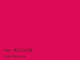 Hex #dd0a58 Color is a normal rose color and the nearest color is Razzmatazz Crayola #e30b5c. Hex code #dd0a58 and RGB value is rgb(221,10,88). In RGB color space, this color is composed of 87% red, 4% green, 35% blue, In CMYK color space, this color is composed of 0% cyan, 95% magenta, 60% yellow , 13% black , In HSL color space, this color has a hue angle of 338° , 91% saturation and 45% lightness.