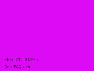Hex #dd0af5 Color is a normal magenta color and the nearest color is Phlox #df00ff. Hex code #dd0af5 and RGB value is rgb(221,10,245). In RGB color space, this color is composed of 87% red, 4% green, 96% blue, In CMYK color space, this color is composed of 10% cyan, 96% magenta, 0% yellow , 4% black , In HSL color space, this color has a hue angle of 294° , 92% saturation and 50% lightness.