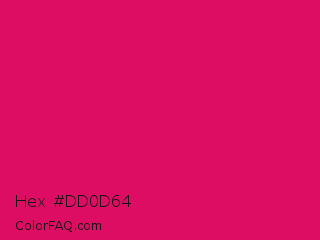 Hex #dd0d64 Color is a normal rose color and the nearest color is Ruby #e0115f. Hex code #dd0d64 and RGB value is rgb(221,13,100). In RGB color space, this color is composed of 87% red, 5% green, 39% blue, In CMYK color space, this color is composed of 0% cyan, 94% magenta, 55% yellow , 13% black , In HSL color space, this color has a hue angle of 335° , 89% saturation and 46% lightness.