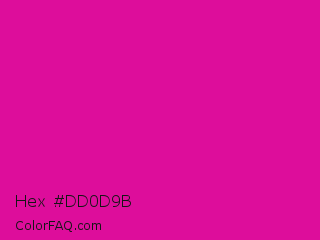 Hex #dd0d9b Color is a normal magenta color and the nearest color is Barbie Pink #e0218a. Hex code #dd0d9b and RGB value is rgb(221,13,155). In RGB color space, this color is composed of 87% red, 5% green, 61% blue, In CMYK color space, this color is composed of 0% cyan, 94% magenta, 30% yellow , 13% black , In HSL color space, this color has a hue angle of 319° , 89% saturation and 46% lightness.