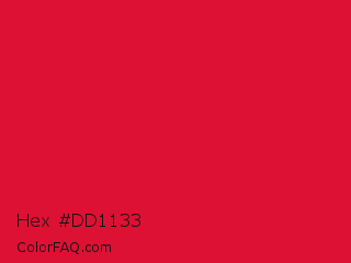 Hex #dd1133 Color is a normal red color and the nearest color is Crimson #dc143c. Hex code #dd1133 and RGB value is rgb(221,17,51). In RGB color space, this color is composed of 87% red, 7% green, 20% blue, In CMYK color space, this color is composed of 0% cyan, 92% magenta, 77% yellow , 13% black , In HSL color space, this color has a hue angle of 350° , 86% saturation and 47% lightness.
