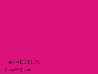 Hex #dd117a Color is a normal rose color and the nearest color is Vivid Cerise #da1d81. Hex code #dd117a and RGB value is rgb(221,17,122). In RGB color space, this color is composed of 87% red, 7% green, 48% blue, In CMYK color space, this color is composed of 0% cyan, 92% magenta, 45% yellow , 13% black , In HSL color space, this color has a hue angle of 329° , 86% saturation and 47% lightness.