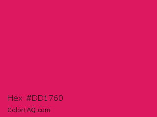 Hex #dd1760 Color is a normal rose color and the nearest color is Ruby #e0115f. Hex code #dd1760 and RGB value is rgb(221,23,96). In RGB color space, this color is composed of 87% red, 9% green, 38% blue, In CMYK color space, this color is composed of 0% cyan, 90% magenta, 57% yellow , 13% black , In HSL color space, this color has a hue angle of 338° , 81% saturation and 48% lightness.