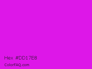 Hex #dd17e8 Color is a normal magenta color and the nearest color is Phlox #df00ff. Hex code #dd17e8 and RGB value is rgb(221,23,232). In RGB color space, this color is composed of 87% red, 9% green, 91% blue, In CMYK color space, this color is composed of 5% cyan, 90% magenta, 0% yellow , 9% black , In HSL color space, this color has a hue angle of 297° , 82% saturation and 50% lightness.