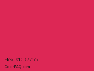 Hex #dd2755 Color is a normal red color and the nearest color is Amaranth #e52b50. Hex code #dd2755 and RGB value is rgb(221,39,85). In RGB color space, this color is composed of 87% red, 15% green, 33% blue, In CMYK color space, this color is composed of 0% cyan, 82% magenta, 62% yellow , 13% black , In HSL color space, this color has a hue angle of 345° , 73% saturation and 51% lightness.