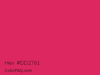 Hex #dd2761 Color is a normal rose color and the nearest color is Cerise Red #de3163. Hex code #dd2761 and RGB value is rgb(221,39,97). In RGB color space, this color is composed of 87% red, 15% green, 38% blue, In CMYK color space, this color is composed of 0% cyan, 82% magenta, 56% yellow , 13% black , In HSL color space, this color has a hue angle of 341° , 73% saturation and 51% lightness.