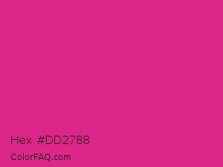 Hex #dd2788 Color is a normal rose color and the nearest color is Barbie Pink #e0218a. Hex code #dd2788 and RGB value is rgb(221,39,136). In RGB color space, this color is composed of 87% red, 15% green, 53% blue, In CMYK color space, this color is composed of 0% cyan, 82% magenta, 38% yellow , 13% black , In HSL color space, this color has a hue angle of 328° , 73% saturation and 51% lightness.