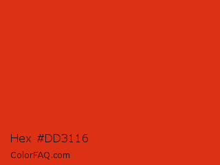 Hex #dd3116 Color is a normal red color and the nearest color is Vermilion #d9381e. Hex code #dd3116 and RGB value is rgb(221,49,22). In RGB color space, this color is composed of 87% red, 19% green, 9% blue, In CMYK color space, this color is composed of 0% cyan, 78% magenta, 90% yellow , 13% black , In HSL color space, this color has a hue angle of 8° , 82% saturation and 48% lightness.