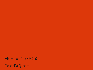 Hex #dd380a Color is a normal red color and the nearest color is Grenadier #d54600. Hex code #dd380a and RGB value is rgb(221,56,10). In RGB color space, this color is composed of 87% red, 22% green, 4% blue, In CMYK color space, this color is composed of 0% cyan, 75% magenta, 95% yellow , 13% black , In HSL color space, this color has a hue angle of 13° , 91% saturation and 45% lightness.