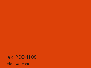 Hex #dd4108 Color is a normal orange color and the nearest color is Grenadier #d54600. Hex code #dd4108 and RGB value is rgb(221,65,8). In RGB color space, this color is composed of 87% red, 25% green, 3% blue, In CMYK color space, this color is composed of 0% cyan, 71% magenta, 96% yellow , 13% black , In HSL color space, this color has a hue angle of 16° , 93% saturation and 45% lightness.
