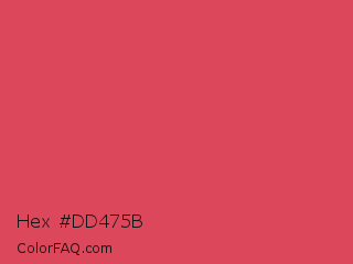 Hex #dd475b Color is a normal red color and the nearest color is Paradise Pink #e63e62. Hex code #dd475b and RGB value is rgb(221,71,91). In RGB color space, this color is composed of 87% red, 28% green, 36% blue, In CMYK color space, this color is composed of 0% cyan, 68% magenta, 59% yellow , 13% black , In HSL color space, this color has a hue angle of 352° , 69% saturation and 57% lightness.