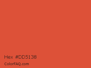 Hex #dd5138 Color is a normal red color and the nearest color is Flame Pea #da5b38. Hex code #dd5138 and RGB value is rgb(221,81,56). In RGB color space, this color is composed of 87% red, 32% green, 22% blue, In CMYK color space, this color is composed of 0% cyan, 63% magenta, 75% yellow , 13% black , In HSL color space, this color has a hue angle of 9° , 71% saturation and 54% lightness.