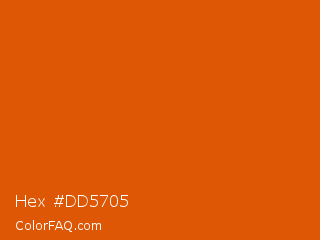 Hex #dd5705 Color is a normal orange color and the nearest color is Bamboo #da6304. Hex code #dd5705 and RGB value is rgb(221,87,5). In RGB color space, this color is composed of 87% red, 34% green, 2% blue, In CMYK color space, this color is composed of 0% cyan, 61% magenta, 98% yellow , 13% black , In HSL color space, this color has a hue angle of 23° , 96% saturation and 44% lightness.