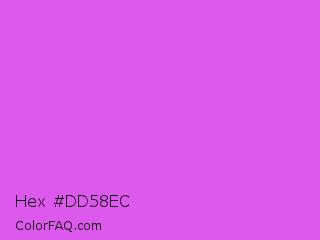 Hex #dd58ec Color is a light magenta color and the nearest color is Orchid #da70d6. Hex code #dd58ec and RGB value is rgb(221,88,236). In RGB color space, this color is composed of 87% red, 35% green, 93% blue, In CMYK color space, this color is composed of 6% cyan, 63% magenta, 0% yellow , 7% black , In HSL color space, this color has a hue angle of 294° , 80% saturation and 64% lightness.