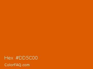 Hex #dd5c00 Color is a normal orange color and the nearest color is Bamboo #da6304. Hex code #dd5c00 and RGB value is rgb(221,92,0). In RGB color space, this color is composed of 87% red, 36% green, 0% blue, In CMYK color space, this color is composed of 0% cyan, 58% magenta, 100% yellow , 13% black , In HSL color space, this color has a hue angle of 25° , 100% saturation and 43% lightness.