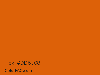 Hex #dd6108 Color is a normal orange color and the nearest color is Bamboo #da6304. Hex code #dd6108 and RGB value is rgb(221,97,8). In RGB color space, this color is composed of 87% red, 38% green, 3% blue, In CMYK color space, this color is composed of 0% cyan, 56% magenta, 96% yellow , 13% black , In HSL color space, this color has a hue angle of 25° , 93% saturation and 45% lightness.