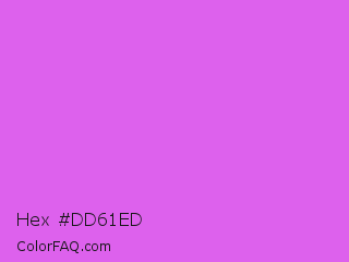 Hex #dd61ed Color is a light magenta color and the nearest color is Heliotrope #df73ff. Hex code #dd61ed and RGB value is rgb(221,97,237). In RGB color space, this color is composed of 87% red, 38% green, 93% blue, In CMYK color space, this color is composed of 7% cyan, 59% magenta, 0% yellow , 7% black , In HSL color space, this color has a hue angle of 293° , 80% saturation and 65% lightness.