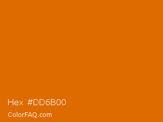 Hex #dd6b00 Color is a normal orange color and the nearest color is Bamboo #da6304. Hex code #dd6b00 and RGB value is rgb(221,107,0). In RGB color space, this color is composed of 87% red, 42% green, 0% blue, In CMYK color space, this color is composed of 0% cyan, 52% magenta, 100% yellow , 13% black , In HSL color space, this color has a hue angle of 29° , 100% saturation and 43% lightness.