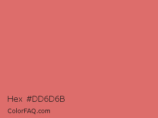 Hex #dd6d6b Color is a light red color and the nearest color is Sunglo #e16865. Hex code #dd6d6b and RGB value is rgb(221,109,107). In RGB color space, this color is composed of 87% red, 43% green, 42% blue, In CMYK color space, this color is composed of 0% cyan, 51% magenta, 52% yellow , 13% black , In HSL color space, this color has a hue angle of 1° , 63% saturation and 64% lightness.
