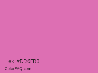 Hex #dd6fb3 Color is a light magenta color and the nearest color is Sky Magenta #cf71af. Hex code #dd6fb3 and RGB value is rgb(221,111,179). In RGB color space, this color is composed of 87% red, 44% green, 70% blue, In CMYK color space, this color is composed of 0% cyan, 50% magenta, 19% yellow , 13% black , In HSL color space, this color has a hue angle of 323° , 62% saturation and 65% lightness.