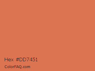 Hex #dd7451 Color is a normal color and the nearest color is Terracotta #e2725b. Hex code #dd7451 and RGB value is rgb(221,116,81). In RGB color space, this color is composed of 87% red, 45% green, 32% blue, In CMYK color space, this color is composed of 0% cyan, 48% magenta, 63% yellow , 13% black , In HSL color space, this color has a hue angle of 15° , 67% saturation and 59% lightness.