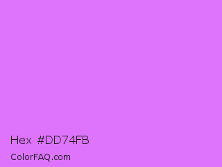 Hex #dd74fb Color is a light purple color and the nearest color is Heliotrope #df73ff. Hex code #dd74fb and RGB value is rgb(221,116,251). In RGB color space, this color is composed of 87% red, 45% green, 98% blue, In CMYK color space, this color is composed of 12% cyan, 54% magenta, 0% yellow , 2% black , In HSL color space, this color has a hue angle of 287° , 94% saturation and 72% lightness.