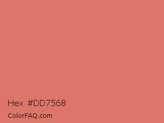 Hex #dd7568 Color is a light red color and the nearest color is Japonica #d87c63. Hex code #dd7568 and RGB value is rgb(221,117,104). In RGB color space, this color is composed of 87% red, 46% green, 41% blue, In CMYK color space, this color is composed of 0% cyan, 47% magenta, 53% yellow , 13% black , In HSL color space, this color has a hue angle of 7° , 63% saturation and 64% lightness.