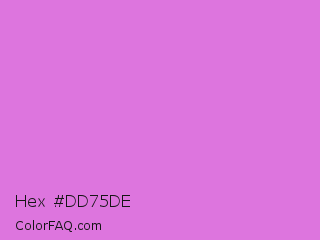 Hex #dd75de Color is a light magenta color and the nearest color is Orchid #da70d6. Hex code #dd75de and RGB value is rgb(221,117,222). In RGB color space, this color is composed of 87% red, 46% green, 87% blue, In CMYK color space, this color is composed of 0% cyan, 47% magenta, 0% yellow , 13% black , In HSL color space, this color has a hue angle of 299° , 61% saturation and 66% lightness.