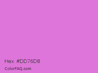 Hex #dd76d8 Color is a light magenta color and the nearest color is Orchid #da70d6. Hex code #dd76d8 and RGB value is rgb(221,118,216). In RGB color space, this color is composed of 87% red, 46% green, 85% blue, In CMYK color space, this color is composed of 0% cyan, 47% magenta, 2% yellow , 13% black , In HSL color space, this color has a hue angle of 303° , 60% saturation and 66% lightness.