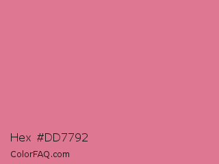 Hex #dd7792 Color is a light rose color and the nearest color is Pale Red Violet #db7093. Hex code #dd7792 and RGB value is rgb(221,119,146). In RGB color space, this color is composed of 87% red, 47% green, 57% blue, In CMYK color space, this color is composed of 0% cyan, 46% magenta, 34% yellow , 13% black , In HSL color space, this color has a hue angle of 344° , 60% saturation and 67% lightness.