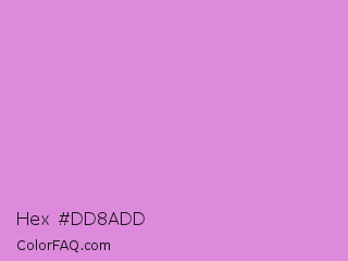 Hex #dd8add Color is a light magenta color and the nearest color is Bright Lilac #d891ef. Hex code #dd8add and RGB value is rgb(221,138,221). In RGB color space, this color is composed of 87% red, 54% green, 87% blue, In CMYK color space, this color is composed of 0% cyan, 38% magenta, 0% yellow , 13% black , In HSL color space, this color has a hue angle of 300° , 55% saturation and 70% lightness.
