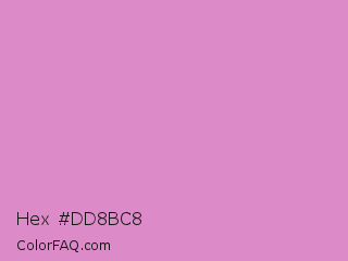 Hex #dd8bc8 Color is a light magenta color and the nearest color is Shocking #e292c0. Hex code #dd8bc8 and RGB value is rgb(221,139,200). In RGB color space, this color is composed of 87% red, 55% green, 78% blue, In CMYK color space, this color is composed of 0% cyan, 37% magenta, 10% yellow , 13% black , In HSL color space, this color has a hue angle of 315° , 55% saturation and 71% lightness.