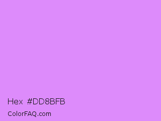 Hex #dd8bfb Color is a light purple color and the nearest color is Bright Lilac #d891ef. Hex code #dd8bfb and RGB value is rgb(221,139,251). In RGB color space, this color is composed of 87% red, 55% green, 98% blue, In CMYK color space, this color is composed of 12% cyan, 45% magenta, 0% yellow , 2% black , In HSL color space, this color has a hue angle of 284° , 93% saturation and 76% lightness.