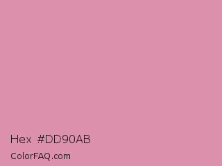 Hex #dd90ab Color is a light rose color and the nearest color is Light Thulian Pink #e68fac. Hex code #dd90ab and RGB value is rgb(221,144,171). In RGB color space, this color is composed of 87% red, 56% green, 67% blue, In CMYK color space, this color is composed of 0% cyan, 35% magenta, 23% yellow , 13% black , In HSL color space, this color has a hue angle of 339° , 53% saturation and 72% lightness.