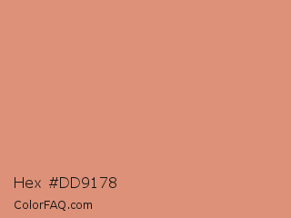 Hex #dd9178 Color is a light color and the nearest color is Burning Sand #d99376. Hex code #dd9178 and RGB value is rgb(221,145,120). In RGB color space, this color is composed of 87% red, 57% green, 47% blue, In CMYK color space, this color is composed of 0% cyan, 34% magenta, 46% yellow , 13% black , In HSL color space, this color has a hue angle of 15° , 60% saturation and 67% lightness.