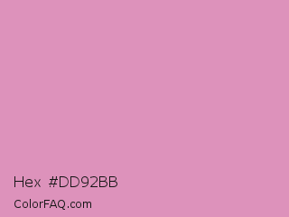 Hex #dd92bb Color is a light magenta color and the nearest color is Shocking #e292c0. Hex code #dd92bb and RGB value is rgb(221,146,187). In RGB color space, this color is composed of 87% red, 57% green, 73% blue, In CMYK color space, this color is composed of 0% cyan, 34% magenta, 15% yellow , 13% black , In HSL color space, this color has a hue angle of 327° , 52% saturation and 72% lightness.