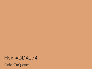Hex #dda174 Color is a light orange color and the nearest color is Whiskey #d59a6f. Hex code #dda174 and RGB value is rgb(221,161,116). In RGB color space, this color is composed of 87% red, 63% green, 45% blue, In CMYK color space, this color is composed of 0% cyan, 27% magenta, 48% yellow , 13% black , In HSL color space, this color has a hue angle of 26° , 61% saturation and 66% lightness.