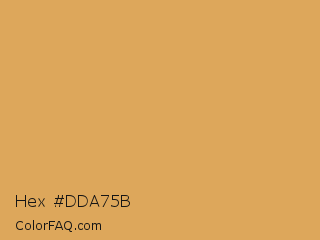 Hex #dda75b Color is a light orange color and the nearest color is Earth Yellow #e1a95f. Hex code #dda75b and RGB value is rgb(221,167,91). In RGB color space, this color is composed of 87% red, 65% green, 36% blue, In CMYK color space, this color is composed of 0% cyan, 24% magenta, 59% yellow , 13% black , In HSL color space, this color has a hue angle of 35° , 66% saturation and 61% lightness.