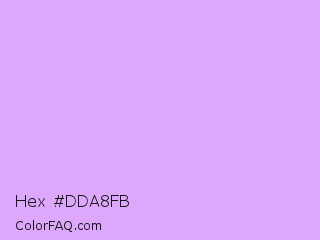 Hex #dda8fb Color is a very light purple color and the nearest color is Mauve #e0b0ff. Hex code #dda8fb and RGB value is rgb(221,168,251). In RGB color space, this color is composed of 87% red, 66% green, 98% blue, In CMYK color space, this color is composed of 12% cyan, 33% magenta, 0% yellow , 2% black , In HSL color space, this color has a hue angle of 278° , 91% saturation and 82% lightness.