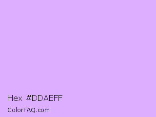 Hex #ddaeff Color is a very light purple color and the nearest color is Mauve #e0b0ff. Hex code #ddaeff and RGB value is rgb(221,174,255). In RGB color space, this color is composed of 87% red, 68% green, 100% blue, In CMYK color space, this color is composed of 13% cyan, 32% magenta, 0% yellow , 0% black , In HSL color space, this color has a hue angle of 275° , 100% saturation and 84% lightness.