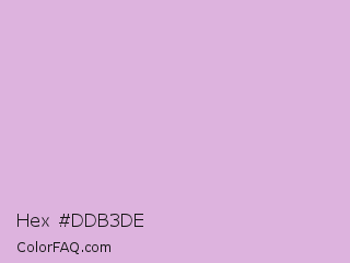 Hex #ddb3de Color is a light magenta color and the nearest color is Pink Lavender #d8b2d1. Hex code #ddb3de and RGB value is rgb(221,179,222). In RGB color space, this color is composed of 87% red, 70% green, 87% blue, In CMYK color space, this color is composed of 0% cyan, 19% magenta, 0% yellow , 13% black , In HSL color space, this color has a hue angle of 299° , 39% saturation and 79% lightness.