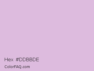 Hex #ddbbde Color is a light magenta color and the nearest color is Thistle #d8bfd8. Hex code #ddbbde and RGB value is rgb(221,187,222). In RGB color space, this color is composed of 87% red, 73% green, 87% blue, In CMYK color space, this color is composed of 0% cyan, 16% magenta, 0% yellow , 13% black , In HSL color space, this color has a hue angle of 298° , 35% saturation and 80% lightness.