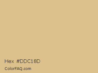 Hex #ddc18d Color is a light orange color and the nearest color is Calico #e0c095. Hex code #ddc18d and RGB value is rgb(221,193,141). In RGB color space, this color is composed of 87% red, 76% green, 55% blue, In CMYK color space, this color is composed of 0% cyan, 13% magenta, 36% yellow , 13% black , In HSL color space, this color has a hue angle of 39° , 54% saturation and 71% lightness.