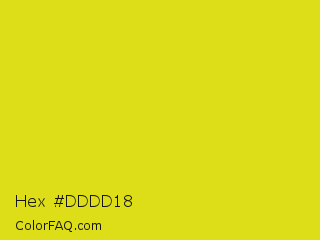 Hex #dddd18 Color is a normal yellow color and the nearest color is Barberry #ded717. Hex code #dddd18 and RGB value is rgb(221,221,24). In RGB color space, this color is composed of 87% red, 87% green, 9% blue, In CMYK color space, this color is composed of 0% cyan, 0% magenta, 89% yellow , 13% black , In HSL color space, this color has a hue angle of 60° , 80% saturation and 48% lightness.