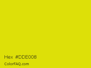 Hex #dde008 Color is a normal yellow color and the nearest color is Peridot #e6e200. Hex code #dde008 and RGB value is rgb(221,224,8). In RGB color space, this color is composed of 87% red, 88% green, 3% blue, In CMYK color space, this color is composed of 1% cyan, 0% magenta, 96% yellow , 12% black , In HSL color space, this color has a hue angle of 61° , 93% saturation and 45% lightness.